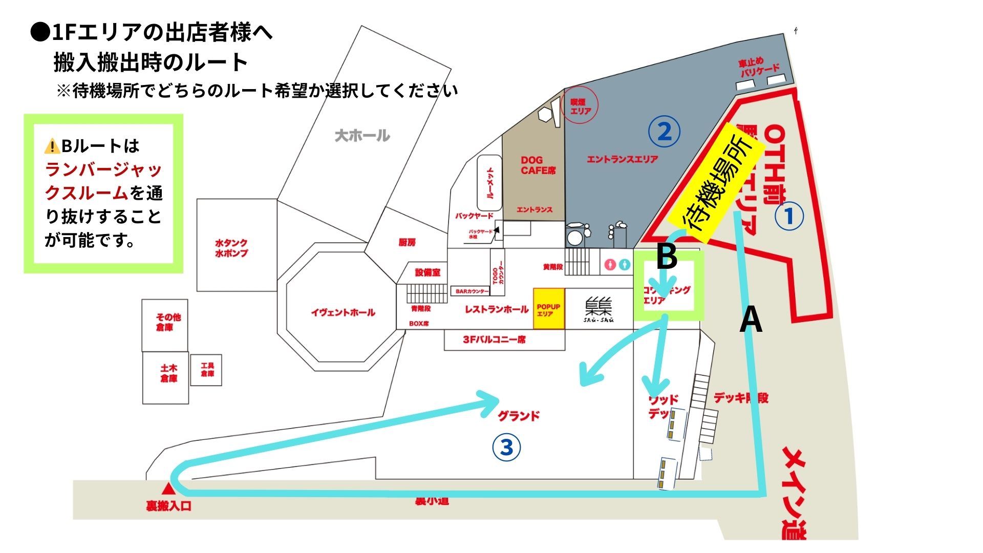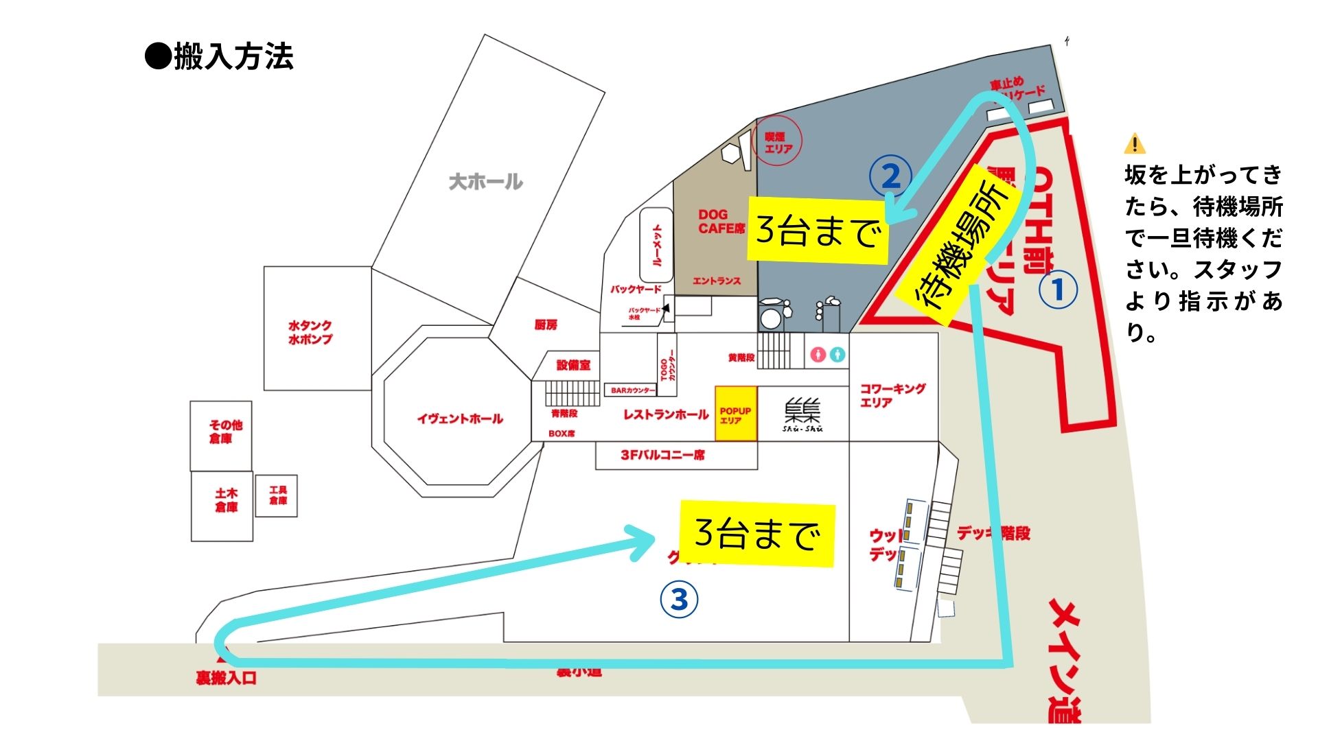 ⚠️スタッフの指示に従って搬入を行います。上記地図の黄色い待機場所にて一旦待機ください。