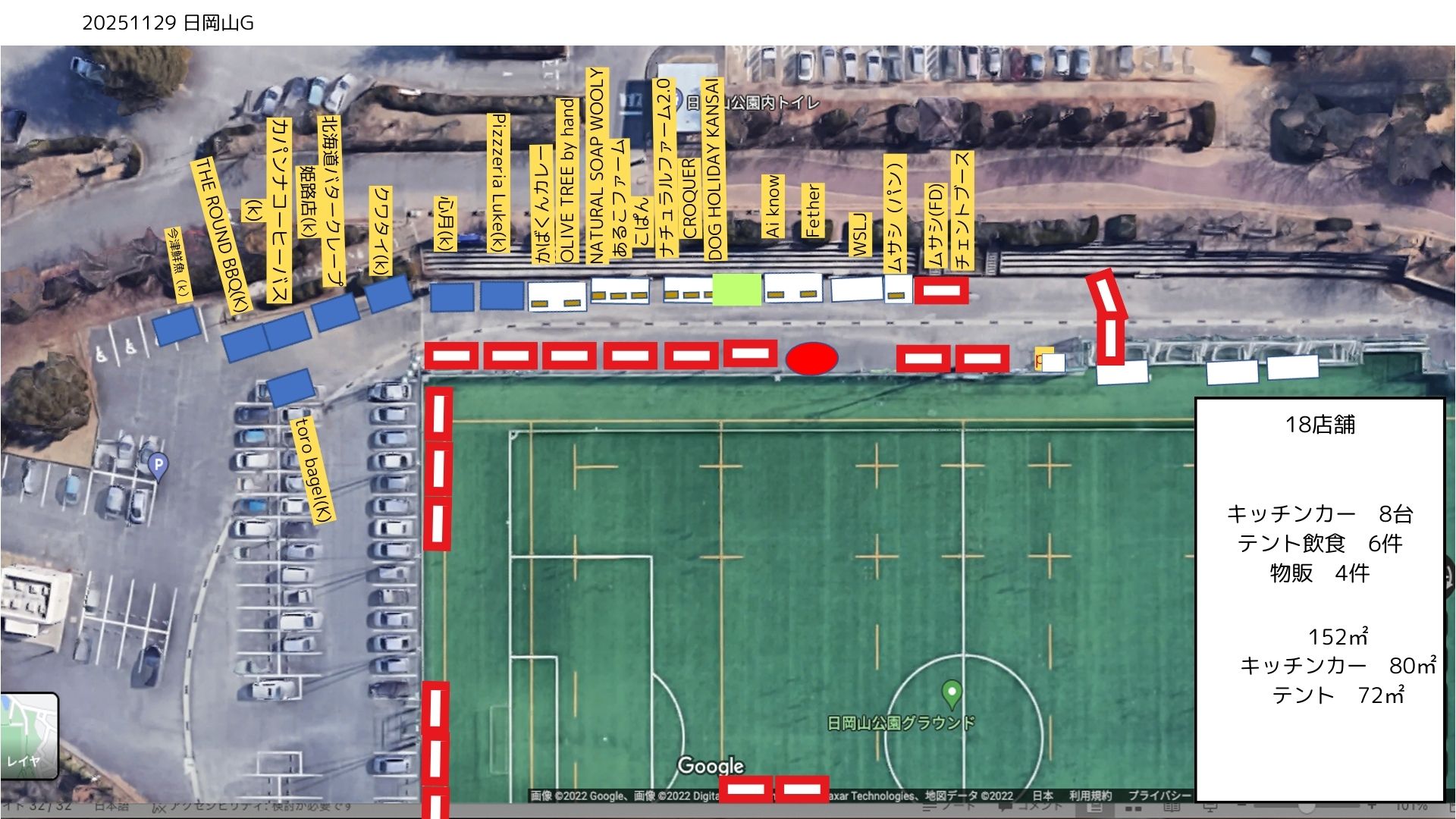 ■図1(搬入経路図)赤ルートでグラウンドに進入(青丸は出店者様駐車場)