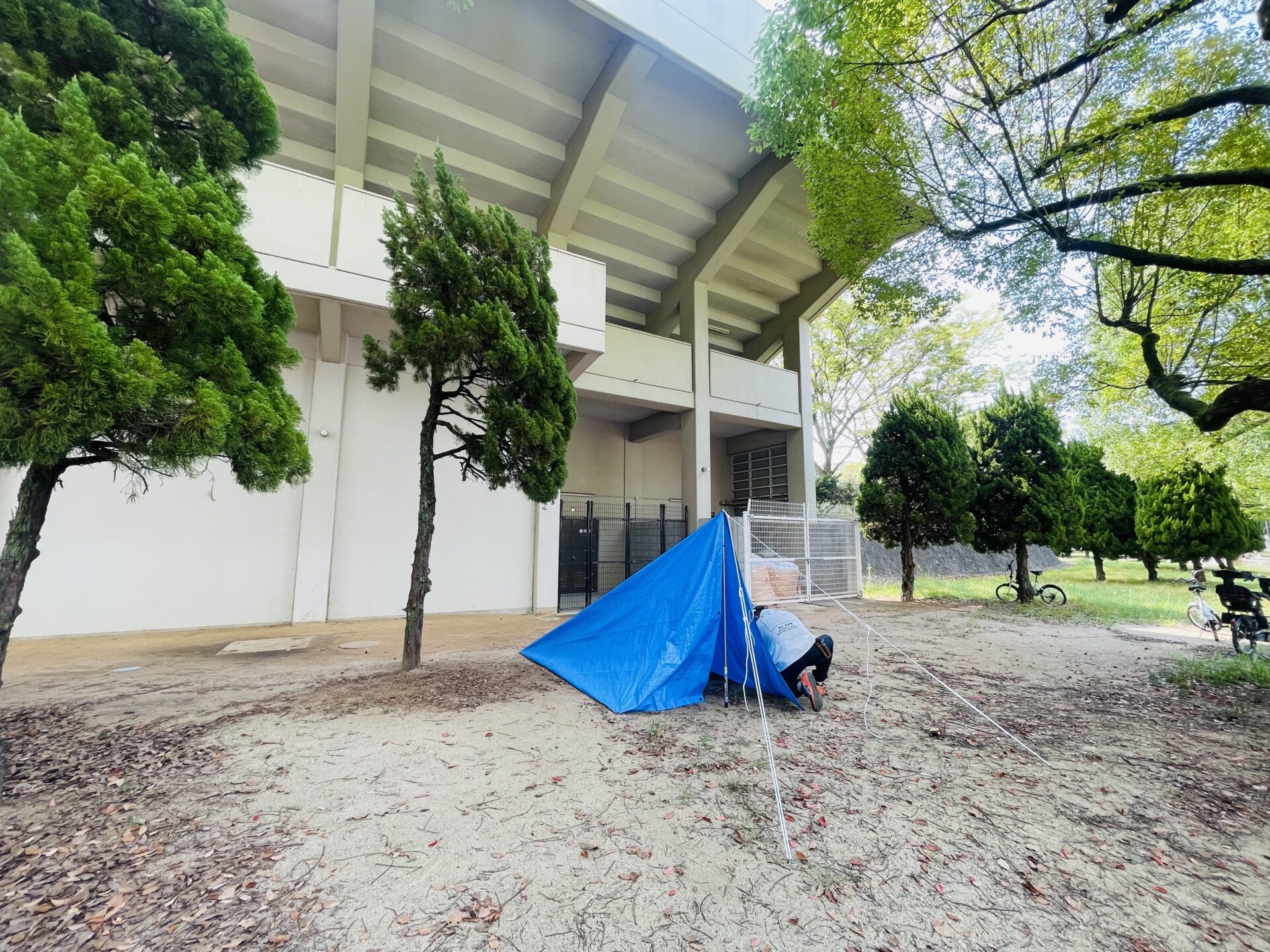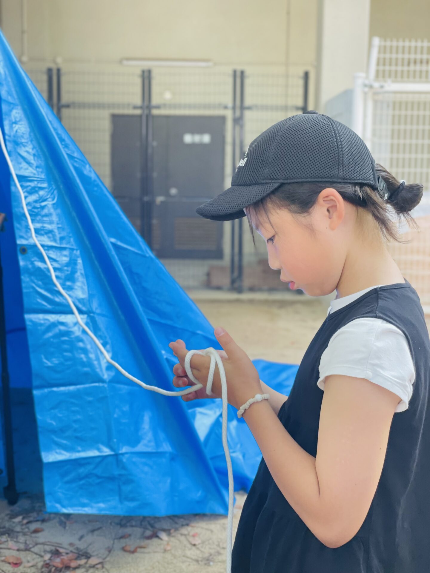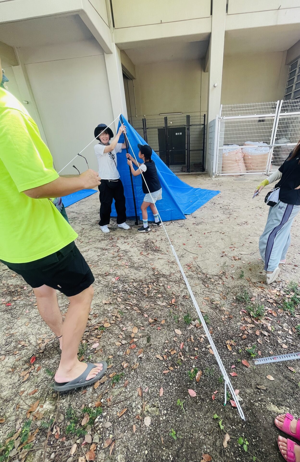 【テーマ】ロープワーク(もやい結びなど3種類)と、みんなで協力してブルーシートを使ったテント設営